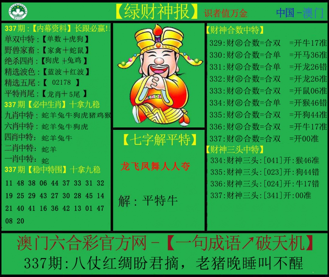 337期: 澳门六合彩彩圖信封【绿财神报】每期自动更新